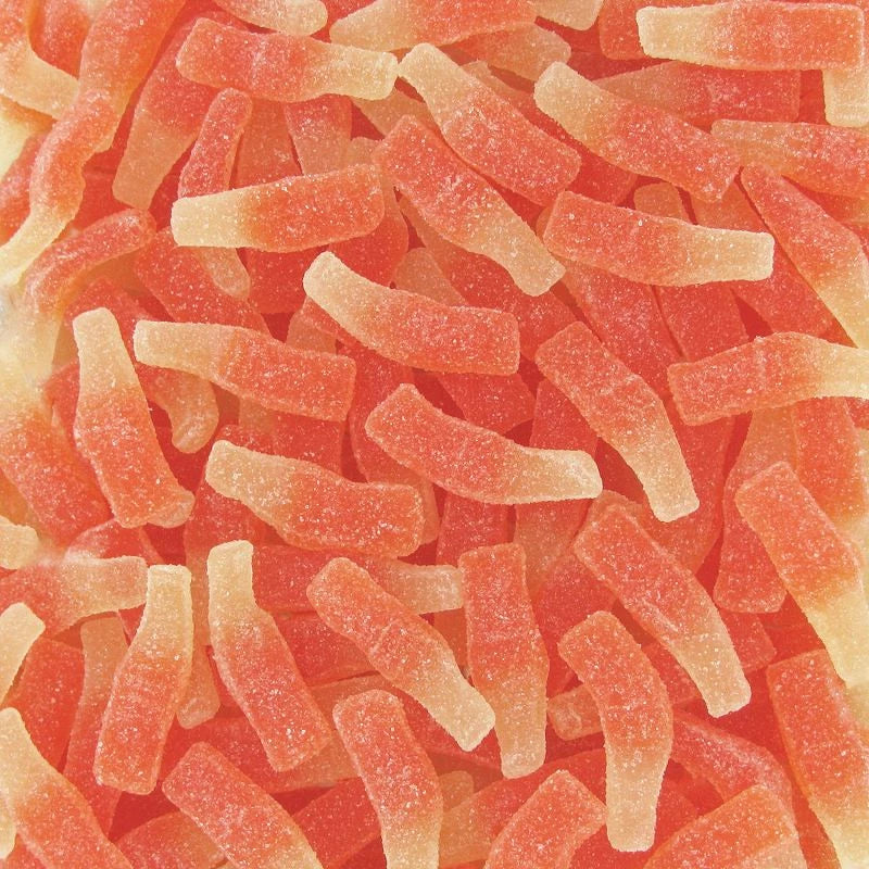 Ingrédients : Sirop de glucose, sucre, eau, gélatine de bœuf (Halal), amidon modifié de pomme de terre, acidifiants : E330 (acide citrique), E270 (acide lactique), arôme artificiel, colorant : E129.