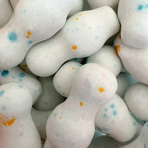Ingrédients : dextrose, sucre, gomme base, sirop de glucose, acidifiant: acide citrique, aromes, humectant: glycérine, amidon modifie, colorants: E133, E141, E160A, concentre de carotte noire, agent denrobage: E904, antioxydant E321.