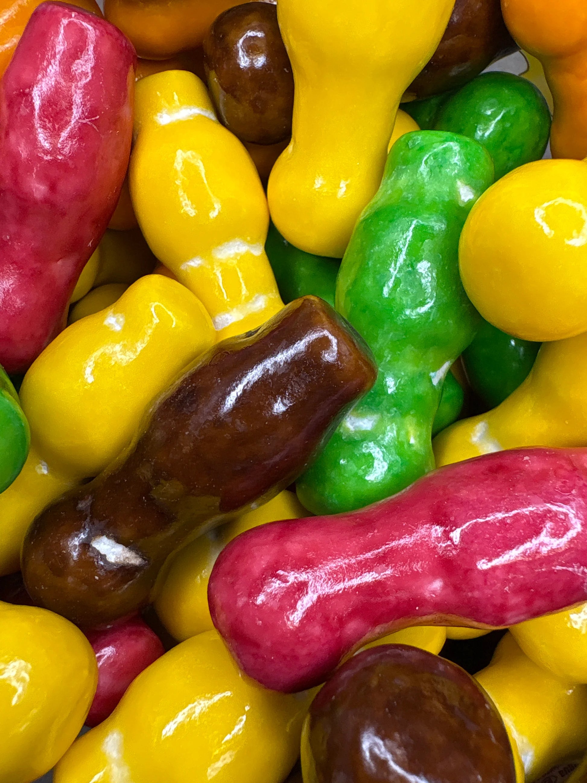 Ingrédients : Dextrose, sucre, gomme base, sirop de glucose, acidifiant: acide citrique; arômes, glycérine, amidon modifié, colorants E133, E150d, E160a, concentré de carotte noire, agents d'enrobage : E903 E904, antioxygène E321.